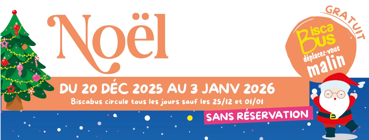 A l’occasion des fêtes de fin d’année, Biscabus circule gratuitement, sans réservation, tous les jours du 20 décembre 2025 au 3 janvier 2026 (sauf les 25/12 et 01/01).